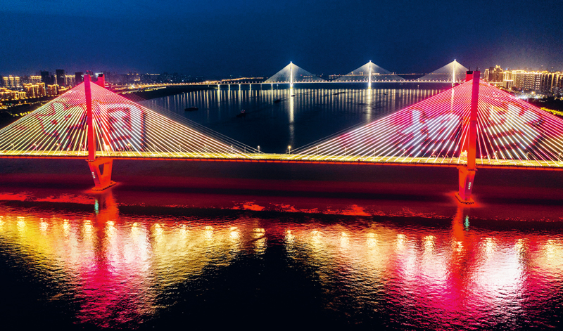 在抗擊新冠肺炎疫情的斗爭(zhēng)中,中國(guó)人民萬(wàn)眾一心、眾志成城,凝聚起強(qiáng)大合力,展現(xiàn)了中國(guó)力量、中國(guó)精神、中國(guó)效率。圖為2020年5月2日晚,湖北武漢長(zhǎng)江二橋燈光秀打出的“中國(guó)擔(dān)當(dāng)”畫面。 中新社發(fā) 趙廣亮/攝