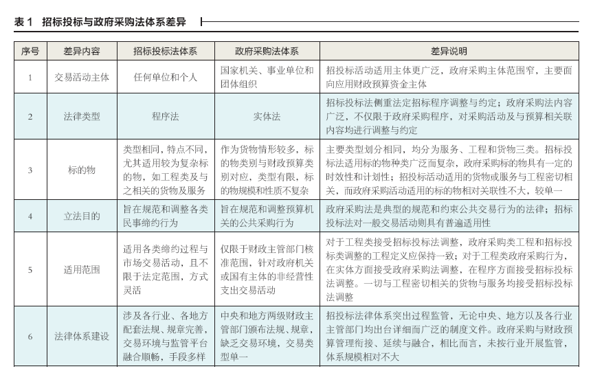 招投標與政府采購活動雖然在本質(zhì)上具有相似性,但從法律體系上看,兩者存在較大差異。關(guān)于兩法體系差異主要體現(xiàn)在交易活動主體、法律類型、標的物特征、適用范圍以及法律體系建設(shè)等方面,詳見表1。