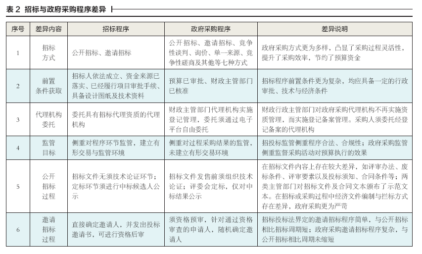 招標方式選擇、前置條件獲取、代理機構(gòu)委托、活動過程的監(jiān)管等均對程序履行產(chǎn)生影響。針對這些方面招投標與政府采購活動存在差異,詳見表2。表2中有關(guān)差異內(nèi)容正是兩法體系及監(jiān)管制度差異的客觀反映。弄清兩類活動程序差異,有利于管理人員找準工作要點,規(guī)范操作行為。