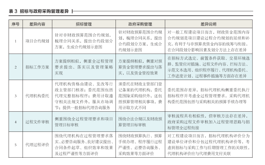 工程建設(shè)項目招標管理是指站在建設(shè)全過程視角對招標活動實施的一系列管理工作。同理,政府采購管理指采購人針對擬組織實施的采購活動開展的一系列管理工作。政府采購管理過程除遵循財政預(yù)算控制要求外,依然需將全過程思想貫穿始終。上述兩類活動管理目標均包括降低過程風險、提升交易效率、確保交易質(zhì)量、滿足全過程管理要求等。招投標或政府采購管理工作內(nèi)容均包括:合約規(guī)劃、工作方案編制、代理機構(gòu)委托、過程文件審核、招標與采購代理過程評價等方面。針對上述內(nèi)容,兩類活動有關(guān)差異內(nèi)容詳見表3。